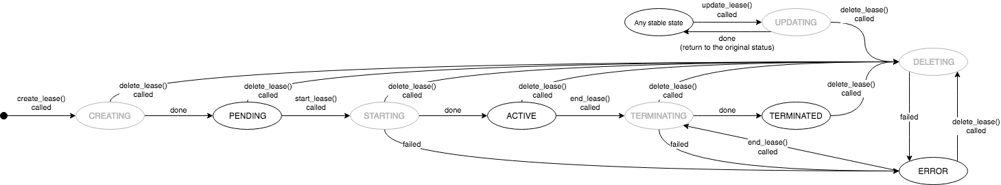 租约状态分为两种类型:稳定状态或过渡状态。在下面的状态图中,稳定状态绘制为黑色节点,而过渡状态绘制为灰色节点。状态转换由 API 调用或租约中的事件触发。