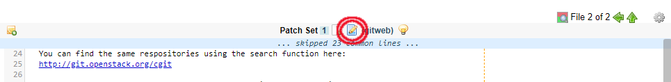 要访问 Gerrit Web 编辑器,请单击 Gerrit 代码评审页面顶部文件补丁集编号旁边的看起来像铅笔写在纸上的图标。