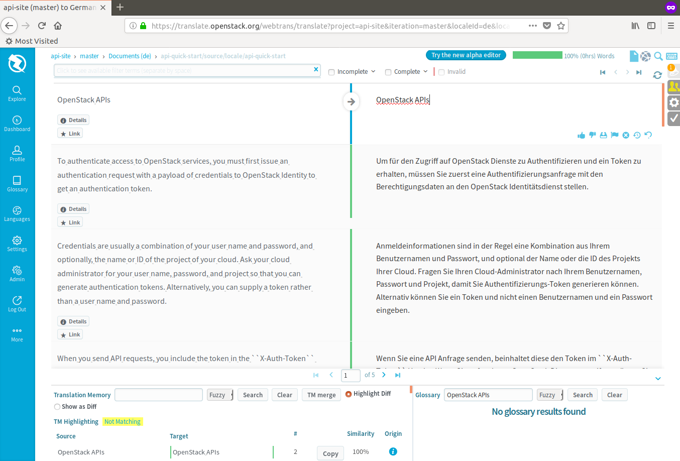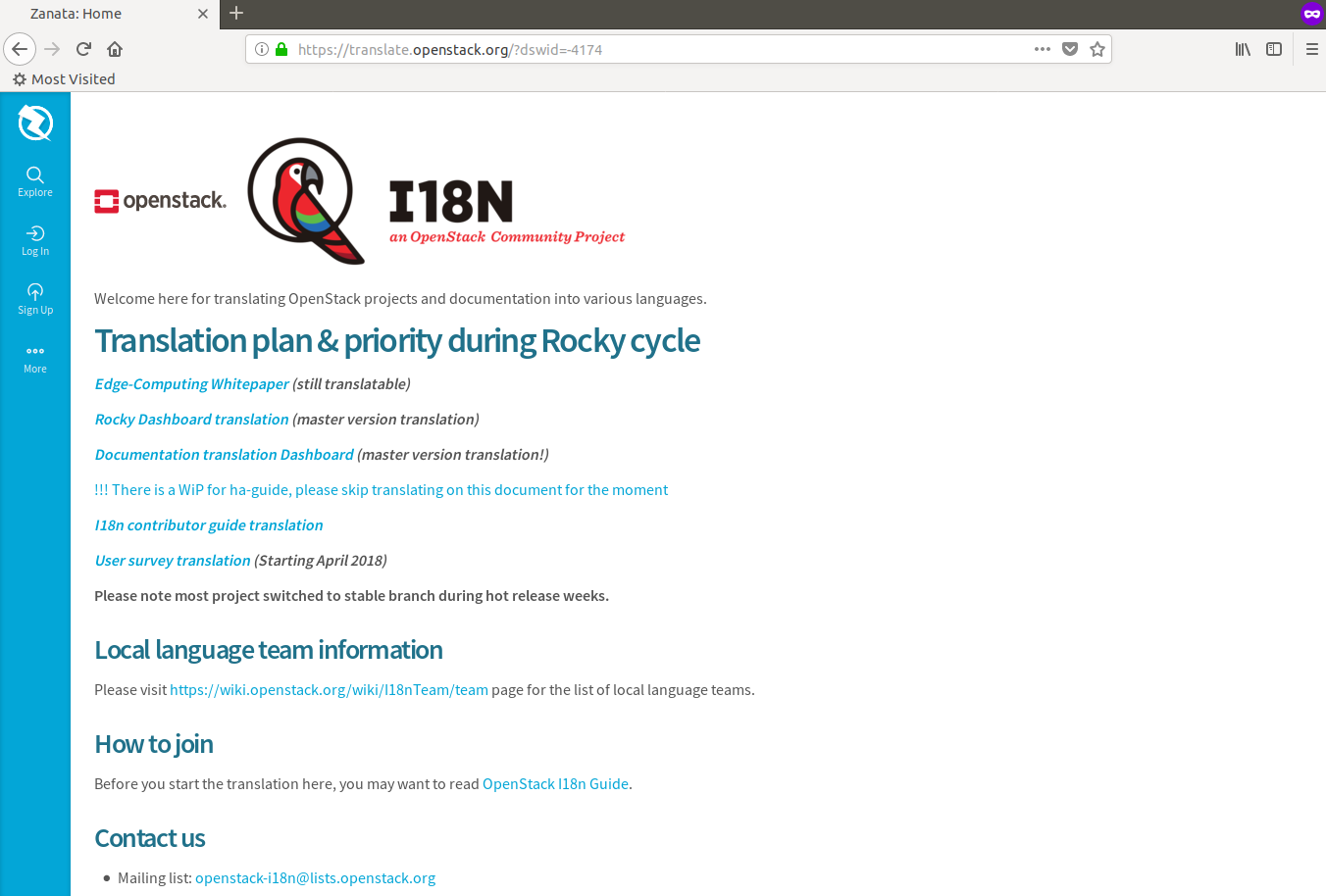 我们使用 Zanata 作为翻译软件项目和文档中字符串的平台。Zanata 提供 Web 用户界面:您只需要一个 Web 浏览器即可开始您的翻译贡献。我们的翻译平台可以在 translate.openstack.org 上访问