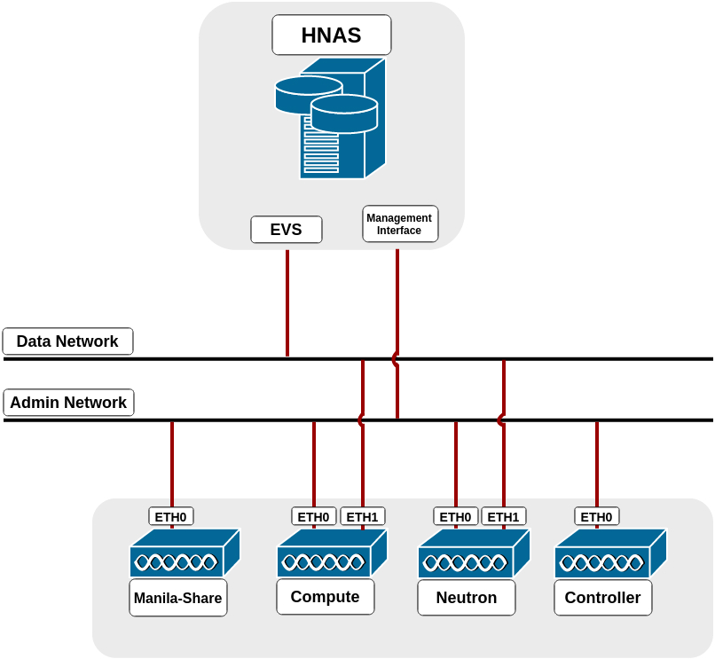 在 Hitachi NAS 平台文件服务 OpenStack 驱动程序使用的驱动程序模式中,driver_handles_share_servers (DHSS) 为 False,驱动程序不处理网络配置,而是由管理员配置。必须能够从 manila-share 节点通过管理网络访问 HNAS 管理界面,同时通过数据接口(EVS IP 或聚合)从 OpenStack Cloud 访问所选 EVS 数据接口,例如通过 neutron flat 网络。以下是示例配置的逐步说明