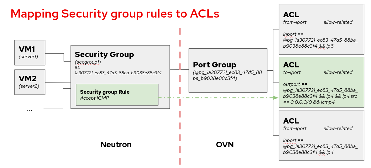 下图显示了 Neutron 安全组框架到 ACL 的映射,这些 ACL 是在使用 ML2/OVN 时启用日志记录的资源。每个安全组规则映射到与包含属于该安全组的所有端口的端口组关联的 ACL。