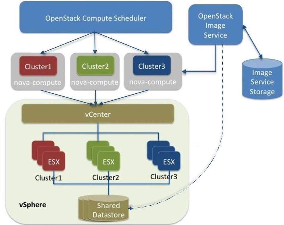 VMware vCenter 驱动程序还与镜像服务交互,以将 VMDK 镜像从镜像服务后端存储复制过来。图中虚线表示 VMDK 镜像从 OpenStack 镜像服务复制到 vSphere 数据存储。VMDK 镜像缓存在数据存储中,因此仅在首次使用 VMDK 镜像时才需要复制操作。