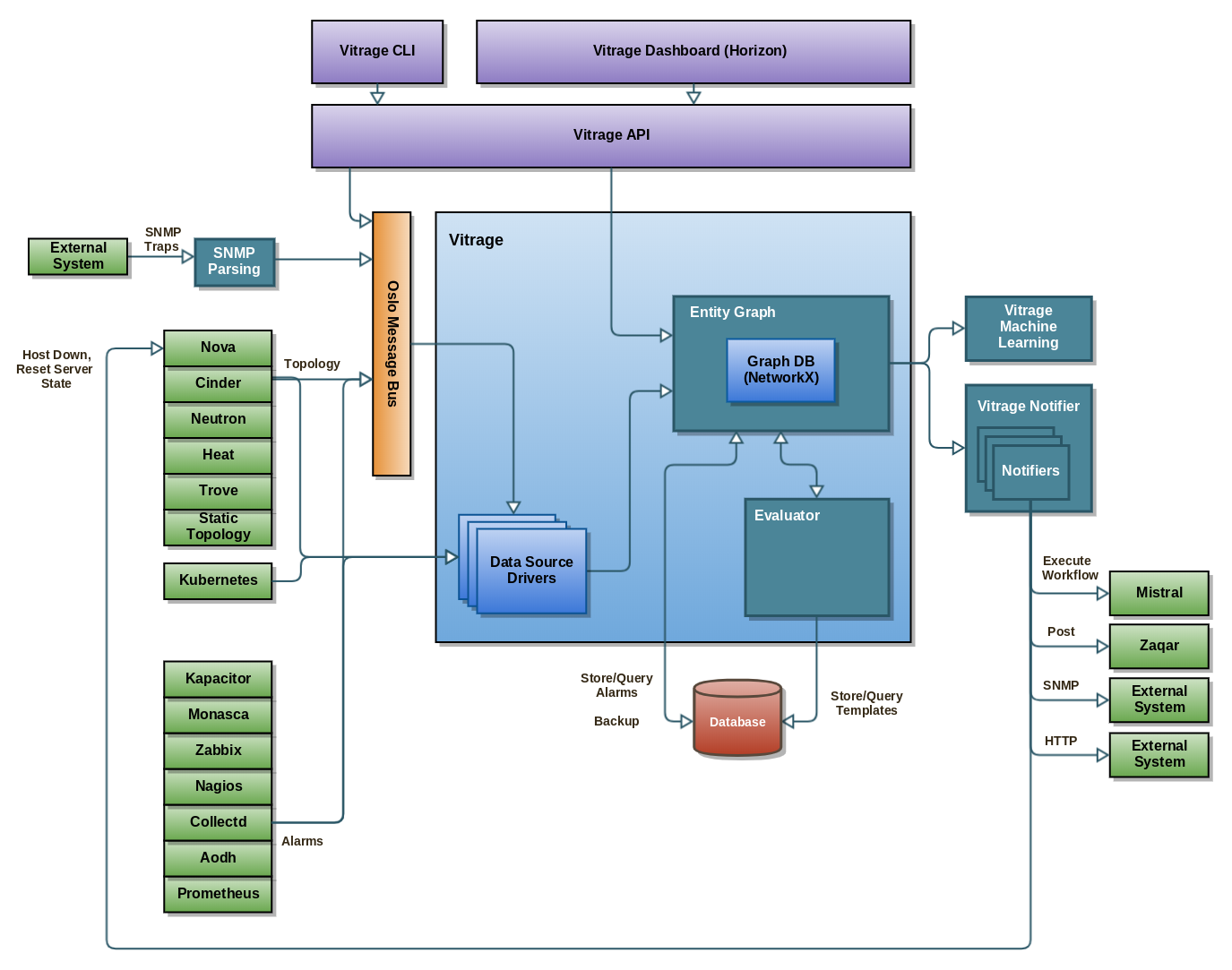 Vitrage 数据源 负责从不同来源导入有关系统状态的信息。这包括有关资源(物理、虚拟和应用程序)和告警的信息。然后将这些信息处理到 Vitrage 图中。目前 Vitrage 支持 OpenStack 数据源,如 Nova、Cinder、Neutron、Heat 和 Aodh,以及外部监控器,如 Nagios、Zabbix 和 collectd。